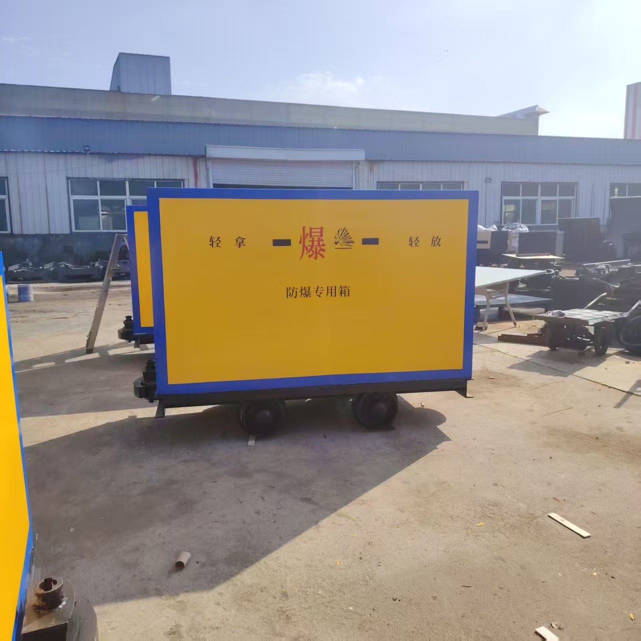 上半部分为外置6-8个厚的防爆钢板,内置10个厚的绝缘木板及2个厚的防火防震防静电的阻燃垫组成的矿用爆破箱;下半部分为可供600轨距、762轨距、900轨距轨道使用的材料车。
