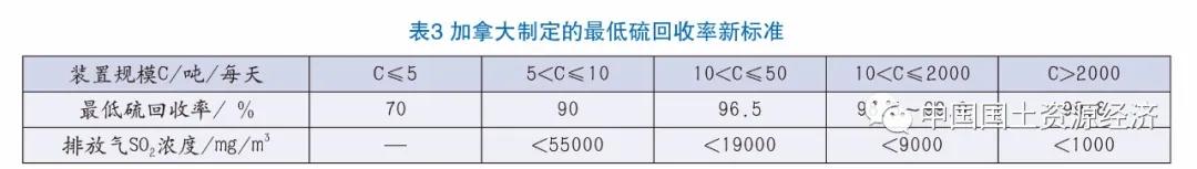 在天然气中提取回收有毒气体硫化氢,是变害为利、变害为宝的重大举措。天然气净化后的酸气中主要含有H2S和CO2等气体,若将酸气直接放空,不仅会对人体造成危害、对环境造成污染,而且是对资源的极大浪费。因此必须对脱硫脱碳后的酸气进行后续处理,主要有四种方式:硫磺回收、生产化工产品、灼烧排放以及酸气回注,其中最经济环保的工艺为硫磺回收。在制定SO2排放标准时,也须充分虑及制硫行业的特殊性,不同国家有不同的标准(参见表2、表3)。