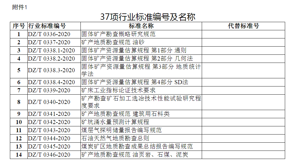 《固体矿产勘查概略研究规范》等37项行业标准和9项行业标准修改单已通过全国自然资源与国土空间规划标准化技术委员会审查,现予批准、发布,并于发布之日起实施。编号及名称见附件。