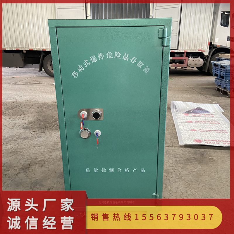 爆破专用炸药柜是和移动炸药库房一块使用的,危险品储存保管柜抗爆防盗窃,可存放雷管或炸药等易燃易爆物品,但是雷管和炸药不能同时放在一个柜子里,需要分开存放。100公斤防爆炸药柜具有很多功能比如:防盗窃、防火灾、防雷击、防静电、防撞击、防重压。防爆炸药柜箱体是用国标防爆钢板材质做成的,同时根据国际防盗要求配有双锁,符合国家公安部民爆器材的存放标准的要求。其次柜子的内层还附有10mm防静电木板和防火抗震阻燃毡。门框也是采用优质加厚钢板内折门框,坚固可靠。山东邦泰炸药柜规格多样,依据可存放的容量,(4件,6件,8件,10件,12件,15件,20件)。表面经过精心的磷化处理,进口喷涂流水线喷涂防静电涂层,产品外观大方并经久耐用。