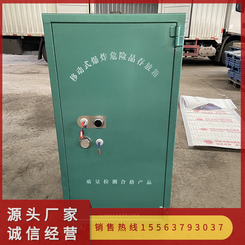 开矿山,修路,建桥梁等都是需要使用雷管炸药的行业和单位,而且在施工过程需要大量的雷管和炸药,由于在储存过程若有不妥,则会发生危险事故,影响生命和财产安全甚至危害社会安全,因此国家对此提出了严格的要求。山东邦泰500公斤爆破器材存放柜在各方权威机构的监督下已经成功检测中心检测合格,符合国家标准。矿用炸药保管箱柜整体有三层结构组成,柜体的外壳是经过高质量表面处理的国标防爆钢板,中间层是附有10mm厚的木质层,木质层具有防止静电摩擦的功能。为了起到防火抗震阻燃的效果,里层还加有1mm厚的阻燃毡。箱体底部四角有伸出的固定柱,使箱体底部与地面有一定的距离,更加防潮,耐腐蚀。